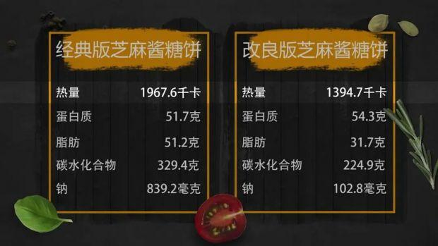 得益于食材的调整,改良版芝麻酱糖饼的热量相比经典版要低30%多,脂肪、碳水化合物、钠盐的含量也有大幅减少,而蛋白质含量稍有增加。陈老师认为它的健康指数有9分。