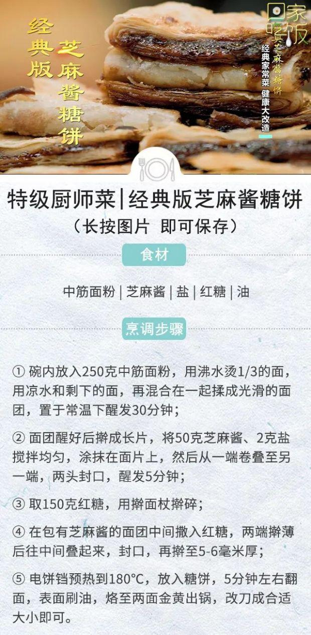 芝麻酱糖饼是烙饼里少见的甜味饼,它既能当正餐,又能当小吃,可以算是一个“全能型选手”。对于很多人来说,大冷天里来一块它,暖和热乎,甜蜜爆浆,还能勾起儿时的美好回忆。
