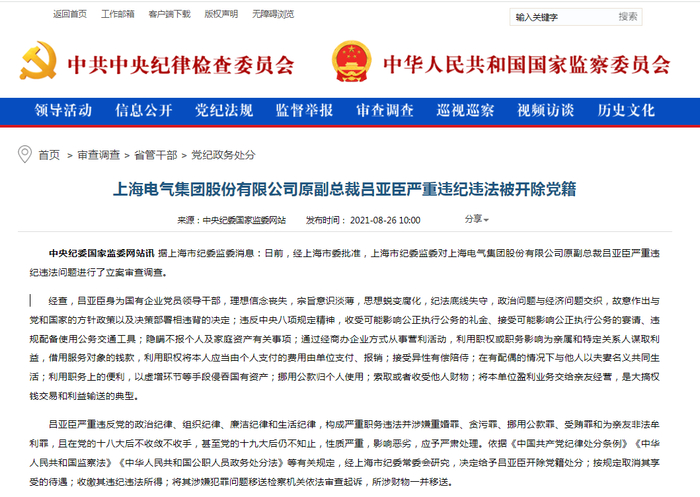 据中央纪委国家监委网站,2021年8月,经上海市委批准,上海市纪委监委对上海电气集团股份有限公司原副总裁吕亚臣严重违纪违法问题进行了立案审查调查。