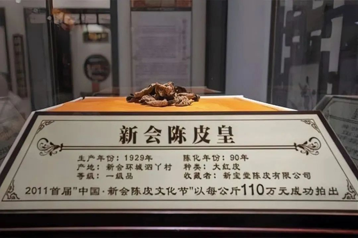 2011年时,在“首届中国新会陈皮文化节”上,一份珍藏自1929年珍藏的陈皮,被拍卖出了每100克11万元人民币的高价。