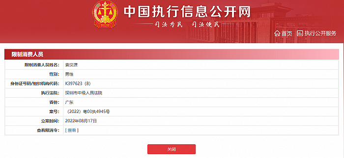 界面新闻多次拔打袁汉源手机,均无人接听。据悉,近期袁汉源申请执行异议。界面新闻发稿前,中国执行信息公开网显示,袁汉源失信信息已删除,不过限制消费令依然存在。