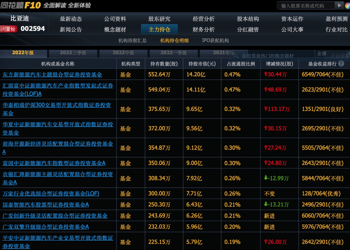 港交所权益披露信息显示,再次减持后,巴菲特持仓仅剩1.3亿股,短短半年时间里,巴菲特已累计减持比亚迪H股超过9500万股,套现约200亿港元。尽管如此,多家公募基金产品依然在2022年第四季度大幅加仓比亚迪A股。