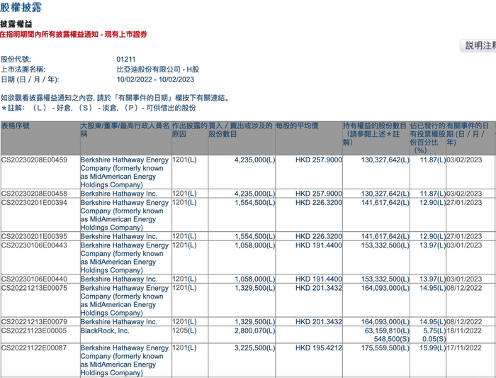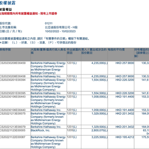 2月9日,港交所权益披露信息显示,巴菲特旗下的伯克希尔哈撒韦公司于2月3日出售了423.5万股比亚迪H股股票,平均价格257.9港元/股,持股比例降至11.87%。持有比亚迪股份14年的伯克希尔哈撒韦公司自2022年8月24日首次减持以来,已经连续发起多次减持比亚迪H股股份的动作,持股比例从2022年8月24日的19.92%下滑至如今的11.87%。