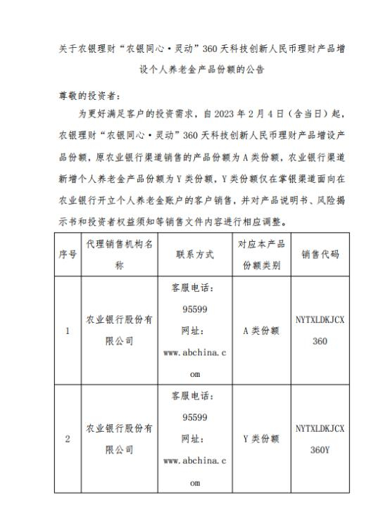 公告显示,为更好满足客户的投资需求,自2023年2月4日(含当日)起,农银理财“农银同心·灵动”360天科技创新人民币理财产品增设产品份额,原农业银行渠道销售的产品份额为A类份额,农业银行渠道新增个人养老金产品份额为Y类份额,Y类份额仅在掌银渠道面向在农业银行开立个人养老金账户的客户销售,并对产品说明书、风险揭示书和投资者权益须知等销售文件内容进行相应调整。