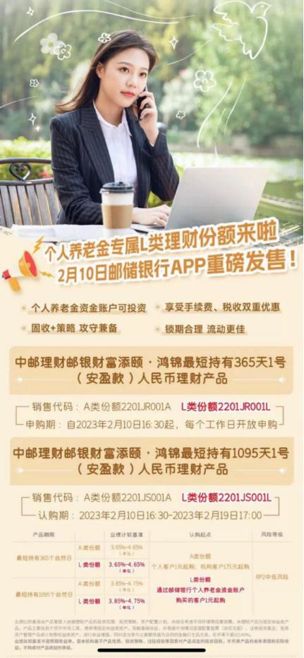据悉,2月10日,中邮理财两只个人养老金理财产品——中邮理财邮银财富添颐·鸿锦最短持有365天1号(安盈款)人民币理财产品、中邮理财邮银财富添颐·鸿锦最短持有1095天1号(安盈款)人民币理财产品正式对外发行,首批入选个人养老金理财产品名单。