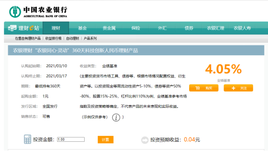 而从介绍来看,农银理财“农银同心·灵动”360天科技创新人民币理财产品主要投资货币市场基金、债券等,根据市场情况配置权益、衍生资产等。以投资现金等高流动性资产5-10%,债券等资产50%-80%,股票15%-25%,杠杆比例110%为例,该产品业绩基准为4.05%。