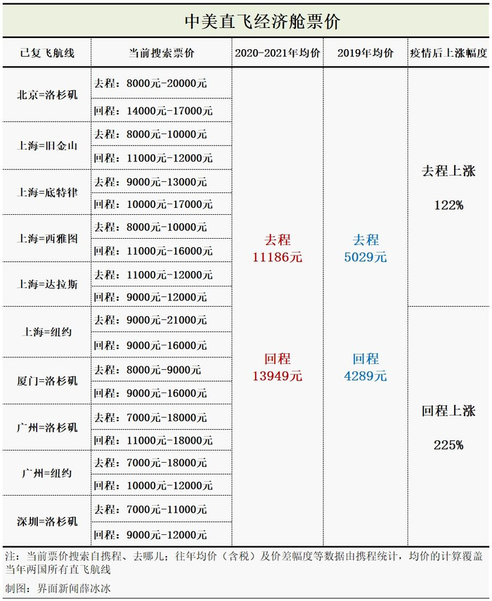 界面新闻通过携程统计数据了解到,疫情高峰期(2020年-2021年)中国飞往美国经济舱均价达到11186元,而2019年经济舱均价只需5029元,涨幅达到122%。