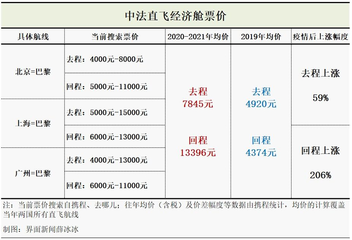 目前中国飞往法国,经济舱票价低的在4000元-6000元,高的在13000元左右。疫情期间中国飞法国经济舱均价为7845元。回程票价,低的在5000元-6000元,相比2019年的均价4374元,还是偏高。