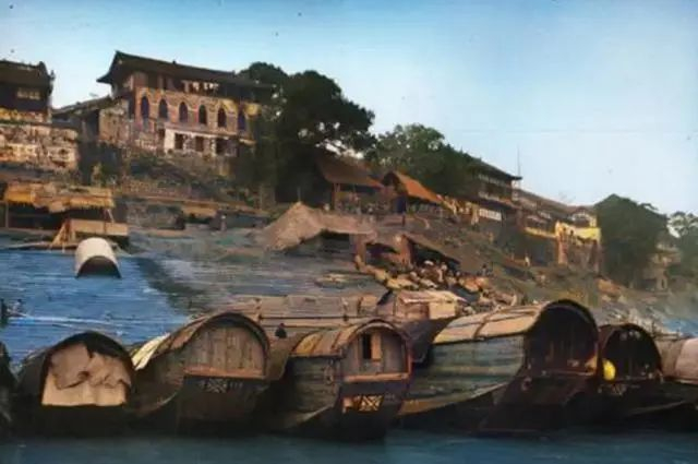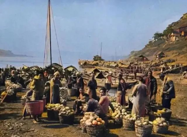 照片中,万县河畔,一艘艘的商船聚集在一起,一座座小贩站在那里,一派欣欣向荣的景象。