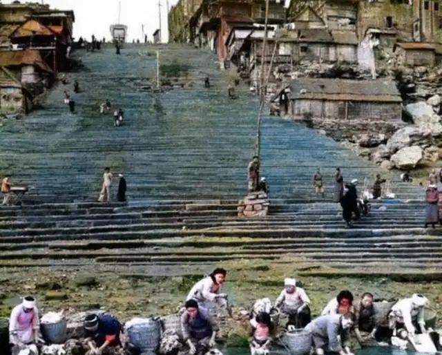 万县杨家街尾,万县杨家街道,一九四六年,女人在长江旁洗衣。