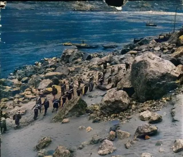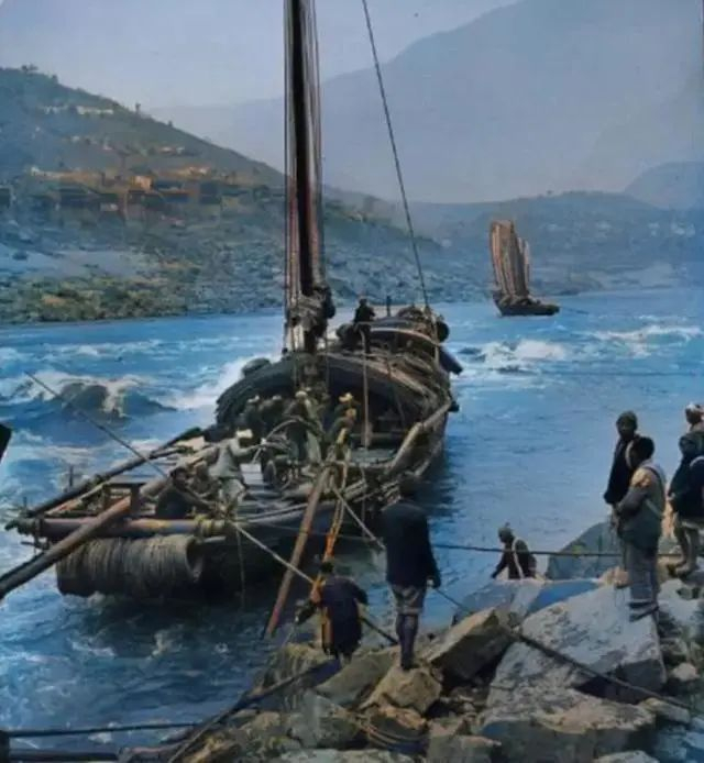 三峡,一九四六年,岸边的纤工,都是拖着小船的。