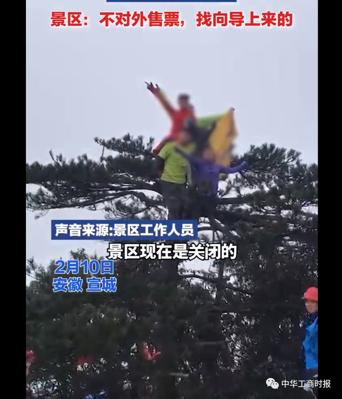 1.【大爷大妈爬景区松树站树顶拍照】2月10日,安徽宣城。有网友发视频,几名大爷大妈在景区玩耍,爬到松树上,站在树顶上拍照打卡。对此,景区工作人员介绍,景区目前是关闭状态,可能是向导将游客带进景区,出了事情景区不承担责任。