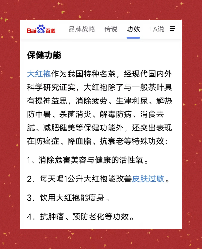 状元回朝后,恰遇皇后得病,百医无效,便将大红袍献上,皇后饮后身体渐康,皇上大喜,命状元亲自前往九龙窠披在茶树上以示龙恩,采制茶叶悉数进贡,不得私匿。从此,武夷岩茶大红袍成为专供皇家享受的贡茶,大红袍的盛名也被世人传开。