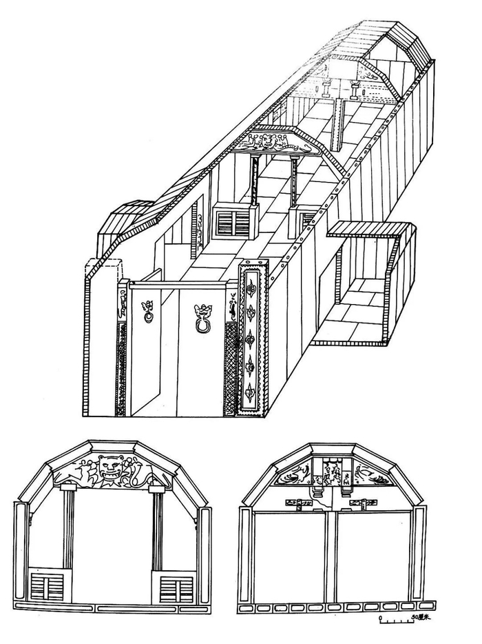 早在战国时期就已有将墓室视为死后居所的做法,曾侯乙墓中的漆绘门窗暗示着对于墓主灵魂已有“游”的概念。然而,此时期的墓葬中并未明确表示出宇宙观。将墓室空间既视为宇宙,又视为住宅的做法,目前仅能追溯到尚未发掘的秦始皇陵。