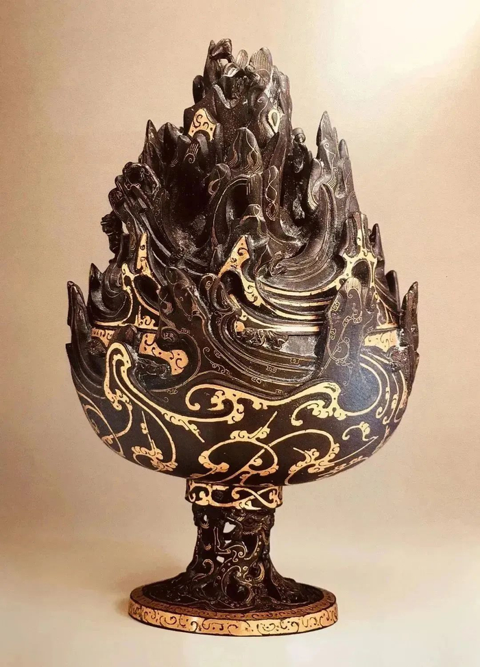 图1/ 博山炉,河北满城汉墓出土,炉上可见山峦与穿梭其间的神兽、动物等(引自中国青铜器全集编辑委员会:《中国青铜器全集12:秦汉卷》,文物出版社,1998,图版一二九、一二八)