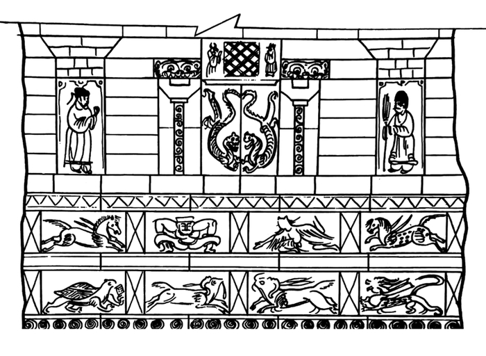 图16/“天门”:上为四川简阳鬼头山崖墓三号石棺,中为甘肃敦煌佛爷庙湾西晋墓照壁,下为重庆巫山县江东嘴小沟子出土的鎏金青铜牌饰(引自李清泉:《“天门”寻踪》)