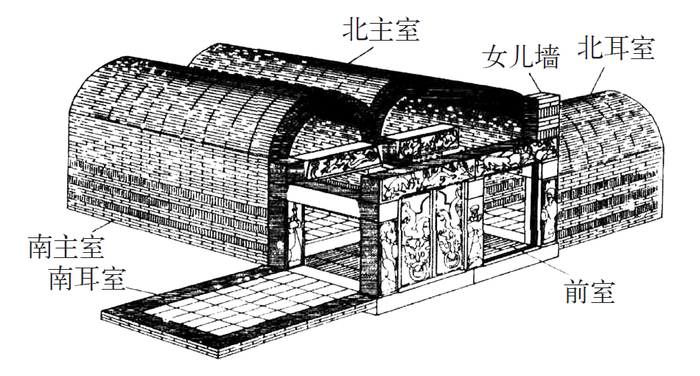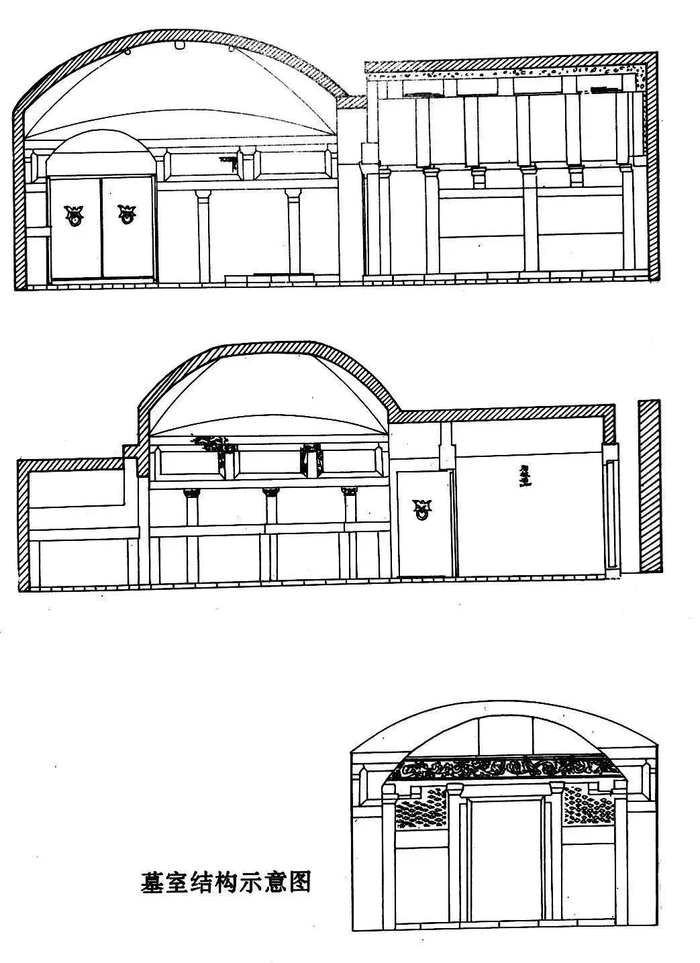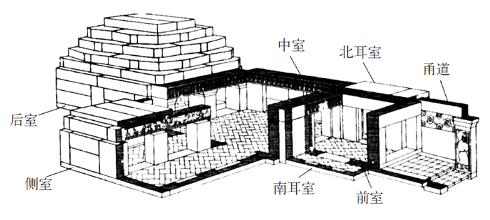 西汉早、中期,墓葬形式出现了巨大的变革。竖穴土坑木椁墓逐渐消失,横穴砖石结构墓葬开始盛行。[14]目前可知最早的石质穹窿顶墓室为徐州铜山的楚元王刘交(公元前201年—前179年在位)墓,[15]后有河南永城芒砀山保安山柿园汉墓(前137)、[16]广州象岗南越王墓(前122)、[17]河北满城汉墓(前113)、[18]曲阜九龙山鲁孝王陵(约宣帝时期)等,[19]都以凿石为室、穿山为藏的方式修筑。俞伟超先生认为:西汉中后期以后,许多砖室墓的形制是受这些墓葬的影响。[20]