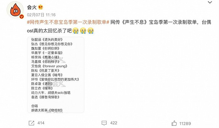 待播的《声生不息·宝岛季》在社媒的讨论度长期居高不下,主要因为节目在卡司阵容、曲目选择、情怀话题等方面都有了相比前季的一个飞跃,中国台湾流行音乐之于大陆听众的普及度比粤语歌更甚,网传歌单里的那英《白天不懂夜的黑》、马嘉祺《你的样子》等都有再翻红的潜质。