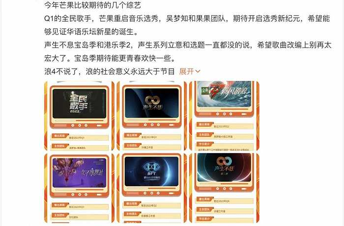 新综项目方面,芒果重启“全国音乐新人选拔”的《全民歌手》发布了全球招募令,腾讯视频上线了携“说姐天团”(傅首尔、杨笠、易立竞、杨天真)打造的《展开说说》,爱奇艺“真种地”的《种地吧》好像在玩一种很新的东西,卫视综艺《今晚开放麦》《17号音乐仓库》《新生万物》等也各具新鲜看点。