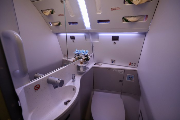 厕所选装的智慧洗手间,是空客最新洗手间构型,比如采用了在当下非常有用的无接触设备和抗菌表面,便利全体旅客。