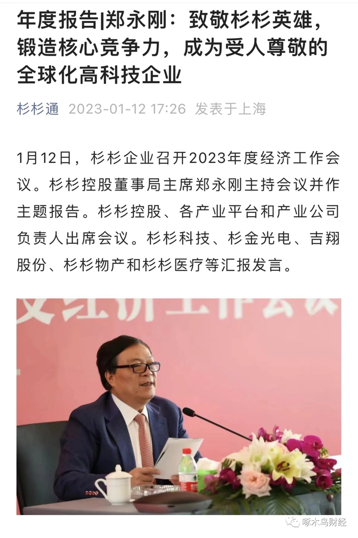 《啄木鸟财经》注意到,郑永刚最后一次公开露面是在2023年1月12日,召开2023年度经济工作会议。郑永刚主持会议并作主题报告,提到杉杉企业要向实而行,做强产业,不断提升上市公司价值;要继续做减法、去杠杆,加快处置非主业资产。杉杉控股、各产业平台和产业公司负责人出席会议。