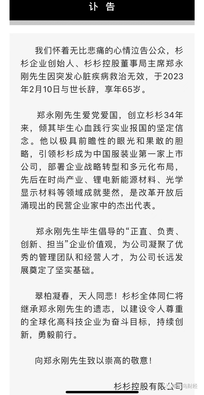 当天17时05分,宁波晚报发布《杉杉控股有限公司董事局主席郑永刚病逝 享年65岁》的消息,但没提病因。