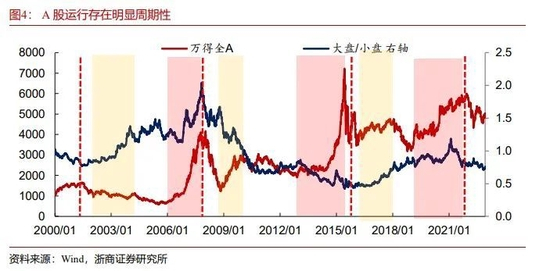 进一步观察风格周期和牛熊周期的嵌套规律,可以发现,每一轮风格周期往往先后有一轮小牛市和一轮大牛市。