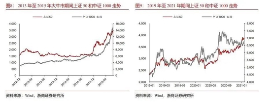 但对小牛市而言,经历了初期普涨后,将走向分化,这与大牛市持续普涨有明显区别。观察四轮牛市中上证50和中证1000走势可以发现,2009年至2010年、2016年至2017年两轮小牛市中,初期普涨,但后期呈现显著分化,2010年仅中证1000上涨,2017年仅上证50上涨;对比2013年至2015年、2019年至2021年可以发现,上证50和中证1000整体普涨。