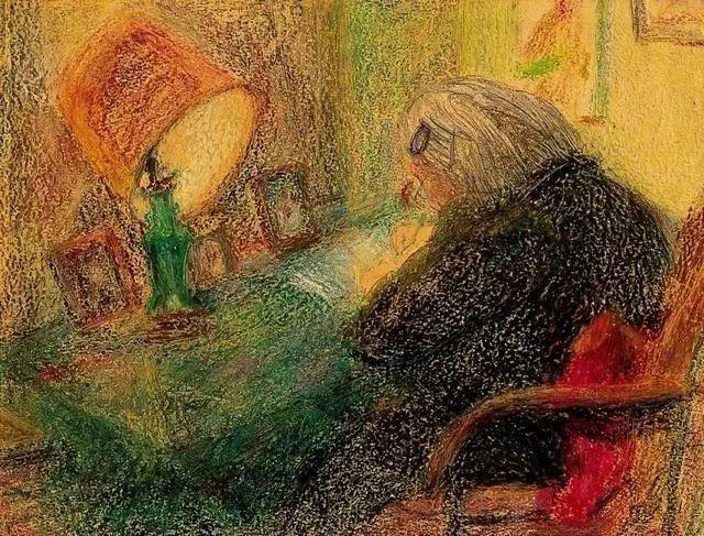 杨苡先生的女儿赵蘅女士画的母亲正在伏案写作回忆的背影。