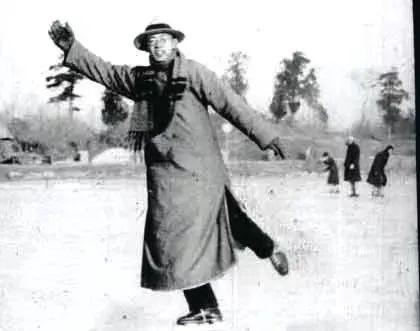 大李先生这张照片不知谁给照的,特别好。好多他教过的学生对他溜冰都有很深印象,就像相片上这样,潇洒极了。我们只能做到不跌跤,顶多会inside curve(内刃滑),他会outside curve(外刃滑),在冰面上滑得很自如。