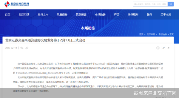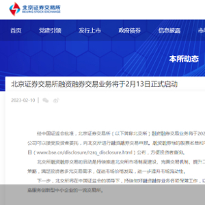 北交所表示,融资融券交易业务将于2月13日正式启动,届时已取得北交所融资融券交易权限的证券公司可以接受投资者委托,向北交所进行融资融券交易申报。据了解,融资融券交易是指投资者向具有北交所会员资格的证券公司提供担保物,借入资金买入证券或借入证券并卖出的行为。