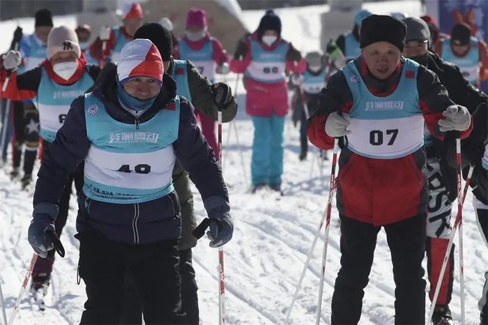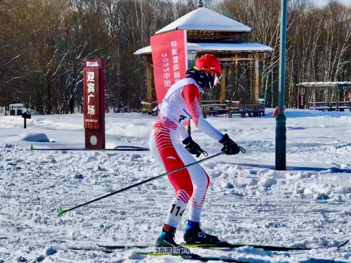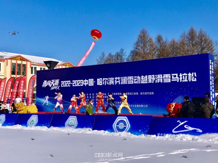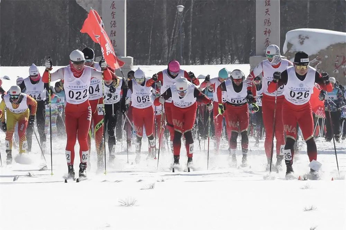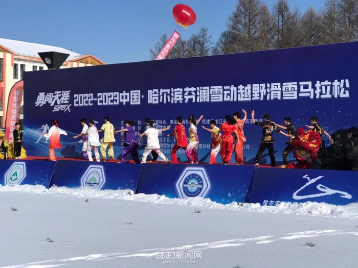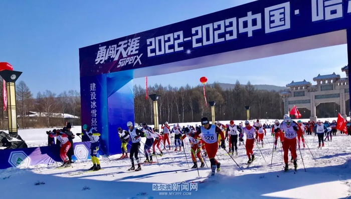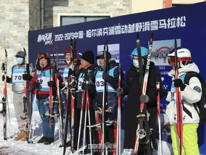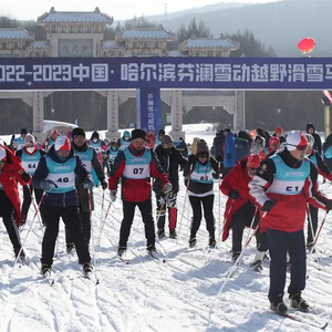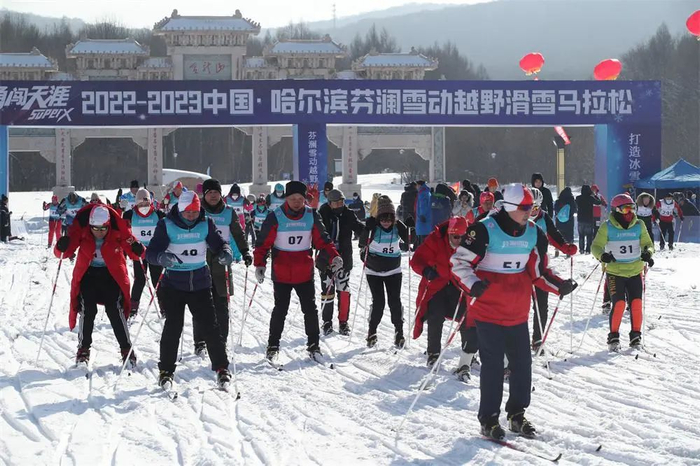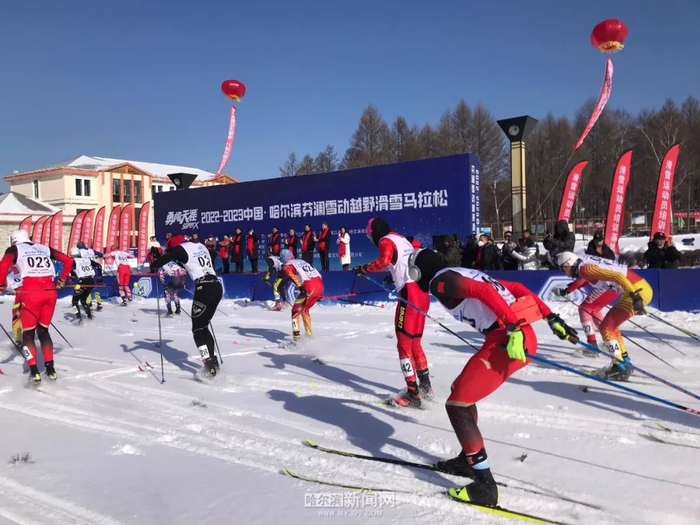 2月12日上午,2022-2023中国 · 哈尔滨芬澜雪动越野滑雪马拉松赛在哈尔滨金龙山越野滑雪训练基地鸣枪开赛。