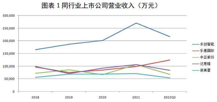 参考同行上市公司中亚股份、新美星、达意隆和乐惠国际。2015年-2021年,中亚股份年营收复合增长率为10.1%,新美星为7.9%,达意隆为4.8%,乐惠国际为5.2%,行业平均增长水平大概在5%-10%之间,永创智能增长的速度要远远超过同行。