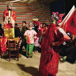 小时候最流行的是地摊社火。地摊社火是在春节前由乡贤或社火头组织几十号人排练,正月初三开始正式演出,彩旗飘飘,锣鼓喧天,白天多以进村入户驱瘟避邪为主。每到一处由春官即兴编词,多为打油诗或者顺口溜,合辙押韵,浅显易懂,祈福祝愿,大快人心。他们才思敏捷,吐字清晰,嗓音洪亮,头戴礼帽,身穿长袍,手执鹰扇,威武霸气。小孩多病的或者夜哭郎由母亲怀抱,跪在十字路口等春官“过关”。这期间当然更少不了男扮女装的“害婆娘”,涂抹成血盆大口,牛铃大眼,两耳吊坠,身背二尺长的烟锅,拿一把老笤帚逢人便扫,说一些祝福的吉利的话语,便会得到一元、十元不等的小钱。夜晚主要是以演唱为主,没有舞台,没有剧本,灯光昏暗,观众围观,找一空旷之地即可表演,形式多种多样,主要有跑旱船、上天官、踢武脚、小曲(十对花、回娘家十二月、十炷香、二姑娘害病、十月怀胎、十二把镰刀)、杂耍、快板等,内容多以取乐和说教为主。
