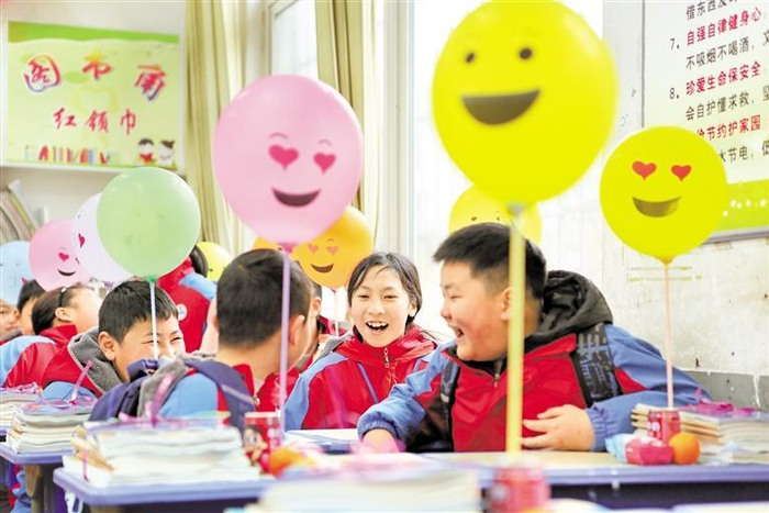2月12日,在黄平县新州镇第一小学,学生有序到校报到,领取新书、小礼品,迎接新学期的到来。学校为学生们精心准备了彩色气球、书本、笔等,寄望学生们新一年能够放飞梦想、心想事成。图为学生们正在互相问候。