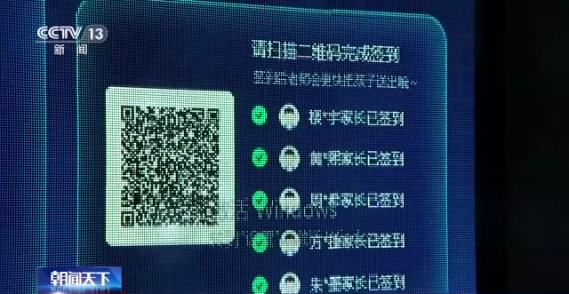 这是金东区第二实验小学“双减通”放学管理的应用场景,蓝、绿、红三色,代表的是不同班级的放学状态,等待的家长能第一时间掌握班级动态。接到孩子后,扫一扫屏幕下方的二维码,就能实现接娃签到。