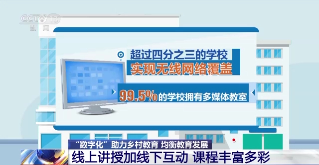 目前,全国中小学(含教学点)互联网接入率达到100%,99.9%的学校出口带宽达到100M以上,超过四分之三的学校实现无线网络覆盖,99.5%的学校拥有多媒体教室。数字化教学条件的不断改善,有效助力了城乡教育的均衡发展。