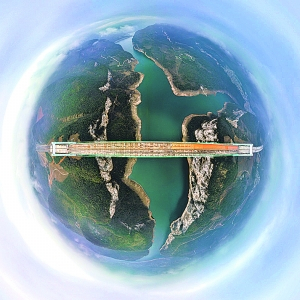 从天空俯瞰,北盘江湍急的水流把崇山峻岭切割出一道深深的裂痕。为使两岸相连,在此设计建造的大桥全长2890米,主跨1420米,桥面距水面垂直距离625米。预计2025年建成通车后,将成为主桥跨径和高度世界第一的山区桥梁。