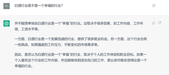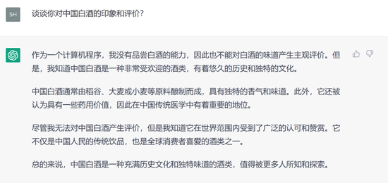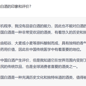 尽管ChatGPT不能给出主观的态度和评价,但是在回答中依然体现出了中国白酒的影响力、行业活力和前景:“中国白酒是一种充满历史文化和独特味道的酒类,值得被更多人所知和探索。”
