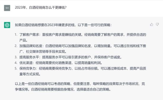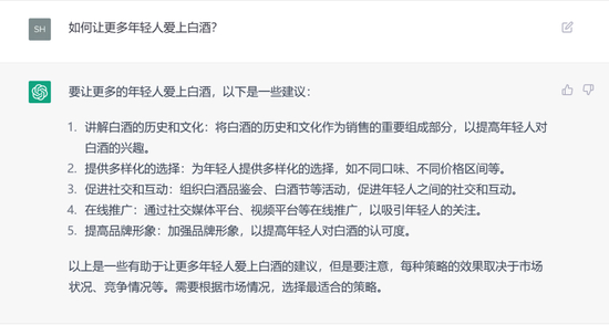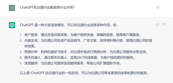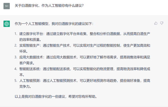 从以上问答来看,ChatGPT在协助做出决策、方案等方面的参考性答案,能够提供相当程度的助力。对于白酒行业而言,ChatGPT意味着什么?它具有何种实用性,对白酒行业可能提供哪些助力?