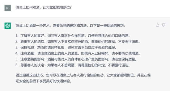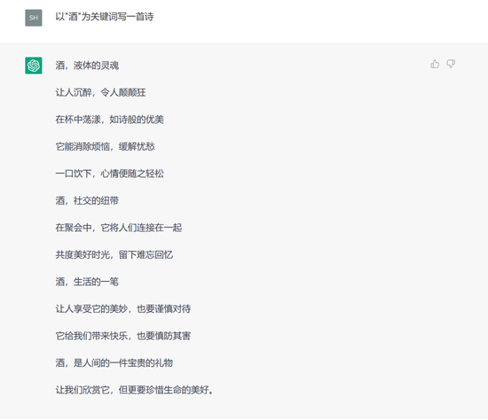 更重要的是,ChatGPT的“多才多艺”可以赋能各行各业:写作业、写小说、写研报、写代码,甚至续写红楼梦,创作不同风格的诗歌。那么,对于极具中国传统特色的白酒行业,ChatGPT又有多少了解?人工智能对于白酒行业,有哪些实用价值和意义?对于白酒消费者,它又能提供哪些帮助?带着这些疑问,酒说和这个横空出世的“网红”聊了聊。