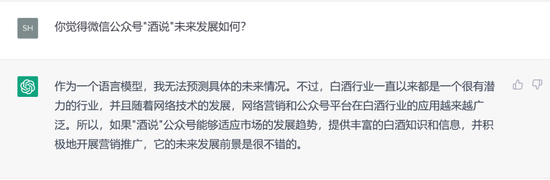 谢谢chatGPT的祝福,专业与活泼兼具的酒说公众号和视频号未来将会更好的前行!大家还有哪些问题想问问ChatGPT人工智能吗,欢迎底部留言,攒一波小编再去咨询AI~