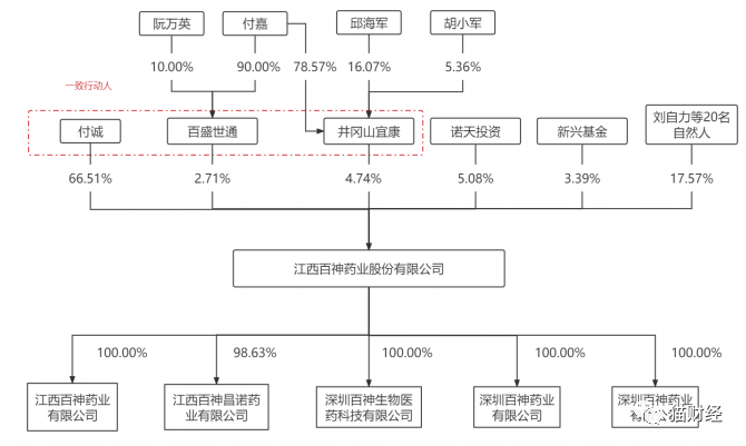截至目前,付诚持有公司66.51%的股份,为百神药业的控股股东及实际控制人。此外,付诚及其一致行动人井冈山宜康、百盛世通持有公司73.96%的股份。其中,付诚与付嘉系兄弟关系,阮万英与付诚、付嘉系母子关系。