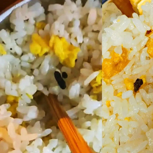 从视频中可以看到,该顾客点的一碗蛋炒饭中,确实有一颗黑色物体格外醒目,黑色物体形状与米粒相似,个头也与米粒大小差不多。该网友表示,自己确信就是老鼠屎,但因为老板拒不承认,当场吃了。
