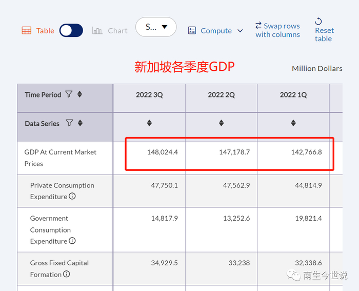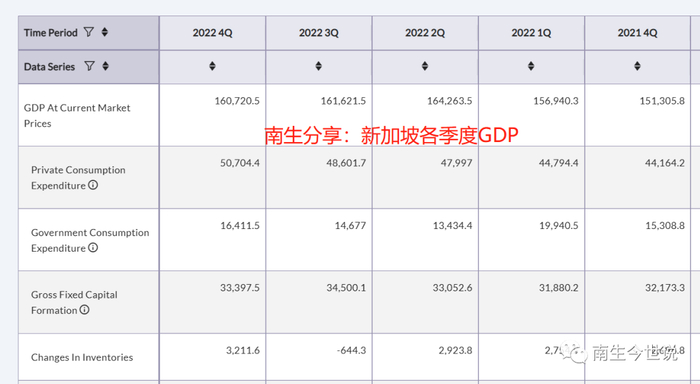 那为何我们计算出来的名义增速却高达13%呢?原因是:新加坡统计局在近期大幅上调了2022年第一季度到第三季度的名义GDP数额。下为新加坡统计在2022年11月份发布的数值,我们可以看到: