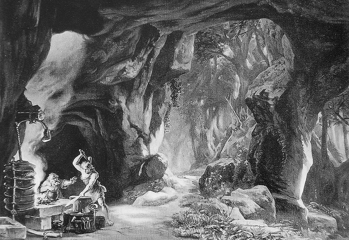 瓦格纳的学生约瑟夫·霍夫曼(Josef Hoffmann)为1876年在拜罗伊特的《指环》首演设计的《齐格弗里德》舞台场景