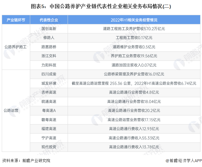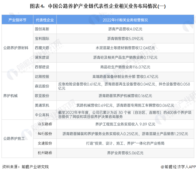 目前,布局了公路养护原材料、机械设备制造、养护施工以及下游的公路运营业务的上市企业中,西部建设在公路养护原材料业务经营规模方面遥遥领先;国创高新在道路工程施工及养护业务经营方面处于领先地位。公路养护产业链上的其它代表性企业布局情况如下: