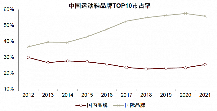 在运动服装品牌中,2021年还出现了一个变化。运动服装前10名的品牌中,国内品牌市占率合计达41%,超过国际品牌的36%,但在运动鞋领域,国外品牌仍旧牢牢占据主流市场,国内品牌市占率合计仅25%,国际品牌市占率合计达到56%,国内品牌在功能性较强的运动鞋领域仍有较大的发展空间。