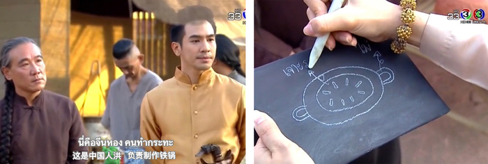泰剧《天生一对》中出现这样的一幕,穿越回大城王国那莱王时期(1656-1688年在位)的女主因为吃不惯当时的泰菜,请求男主请中国师傅打造一个铁锅