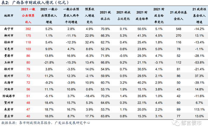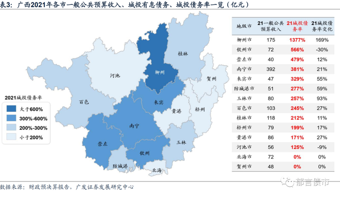位列GDP第四梯队的崇左、贺州、来宾、防城港一般公共预算收入较低,不足55亿元。崇左、贺州、来宾2021年一般公共预算收入增速较高,在18%左右,增速居省内前列,其中来宾2021年政府性基金收入为69亿元,较2020年增长113.1%。债务负担方面,崇左2021年城投债务率达479%,处于省内偏高水平。